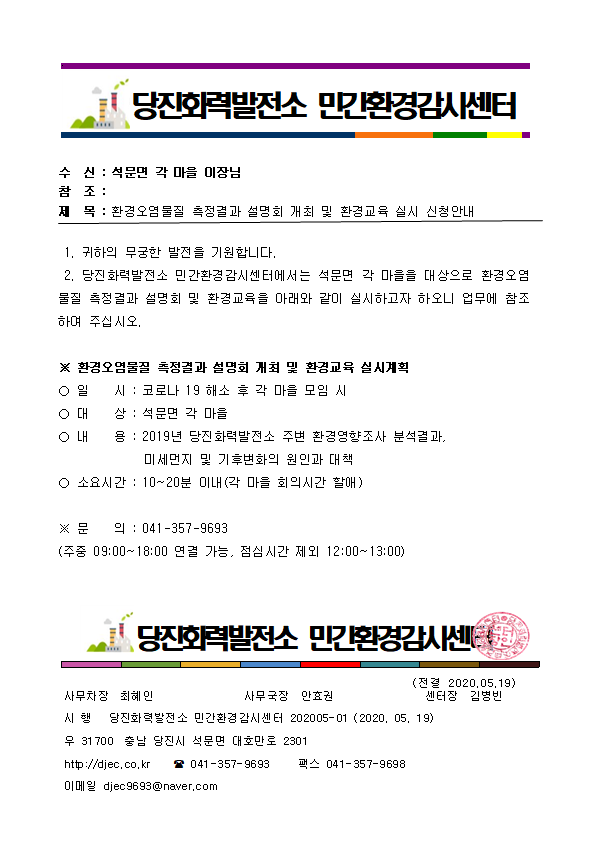 글제목 : 환경오염물질 측정결과 설명회 개최 및 환경교육 실시 신청접수 안내 페이지 정보 작성자 감시센터 작성일 20-05-19 14:43 본문 목록 이전글감시센터 소개 및 발전소 견학안내, 환경교육 실시 알림 및 신청접수 안내 20.05.19 다음글2020년 제2차 정기 운영위원회 개최 공지의 건 20.06.16